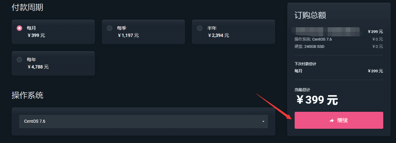 2、在产品配置页选择付款周期、操作系统和其它配置项,点击【继续】,跳转到确认信息页面。