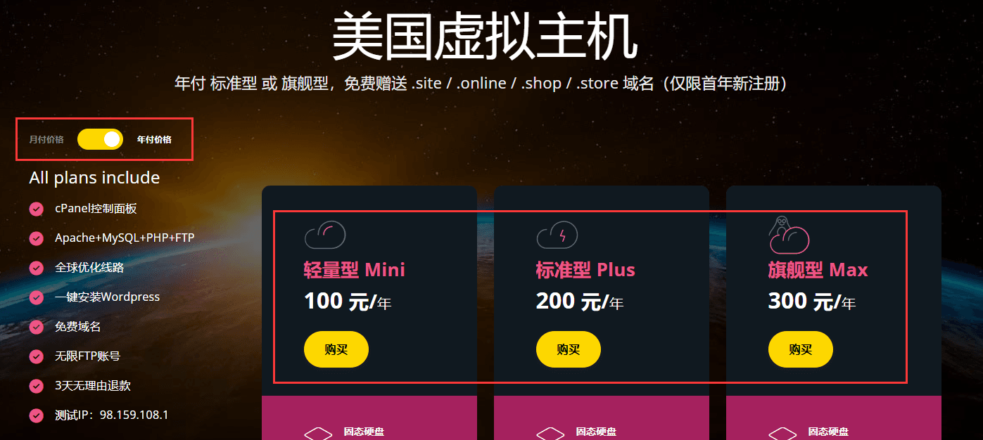 在此页面选择付款周期(可选月付/年付)、型号(可选轻量型 Mini/标准型 Plus/旗舰型 Max),如下图所示: