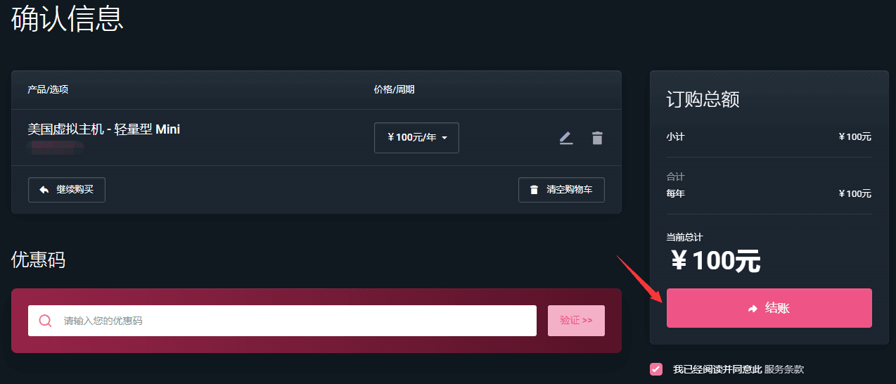 3、在确认信息页面选择付款方式,点击结账并完成付款后,美国虚拟主机即购买成功,实时开通后可在会员中心查看和管理。