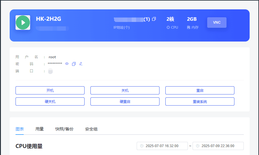 我们还可以在此界面查看硬件图标、带宽用量,以及管理快照/备份、安全组。