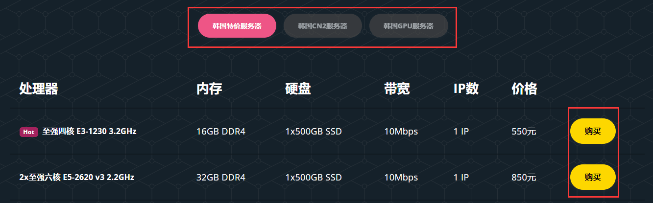 选择需要的韩国服务器分类直接点击,然后选择要购买的产品点击【购买】,跳转到产品配置页面。
