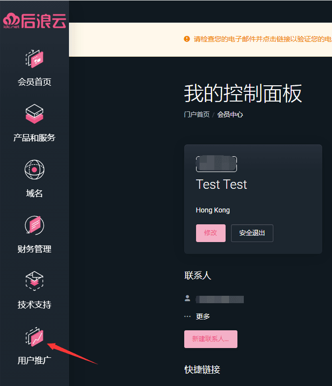 1、登陆后浪云账号,并进入会员中心首页(https://my.idc.net/clientarea.php),在左侧菜单烂找到【用户推广】并点击,进入激活推广账户页面。(也可直接访问:https://my.idc.net/affiliates.php)