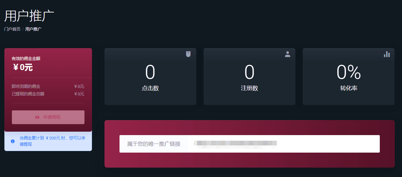 3、用户推广页面,可以获取属于您的唯一推广链接。使用您的专属链接在您的网站,电子邮件,社交媒体等分享推广后浪云。每成功推荐一次,即可赚取可持续佣金,登陆后台查看跟踪您的佣金情况。