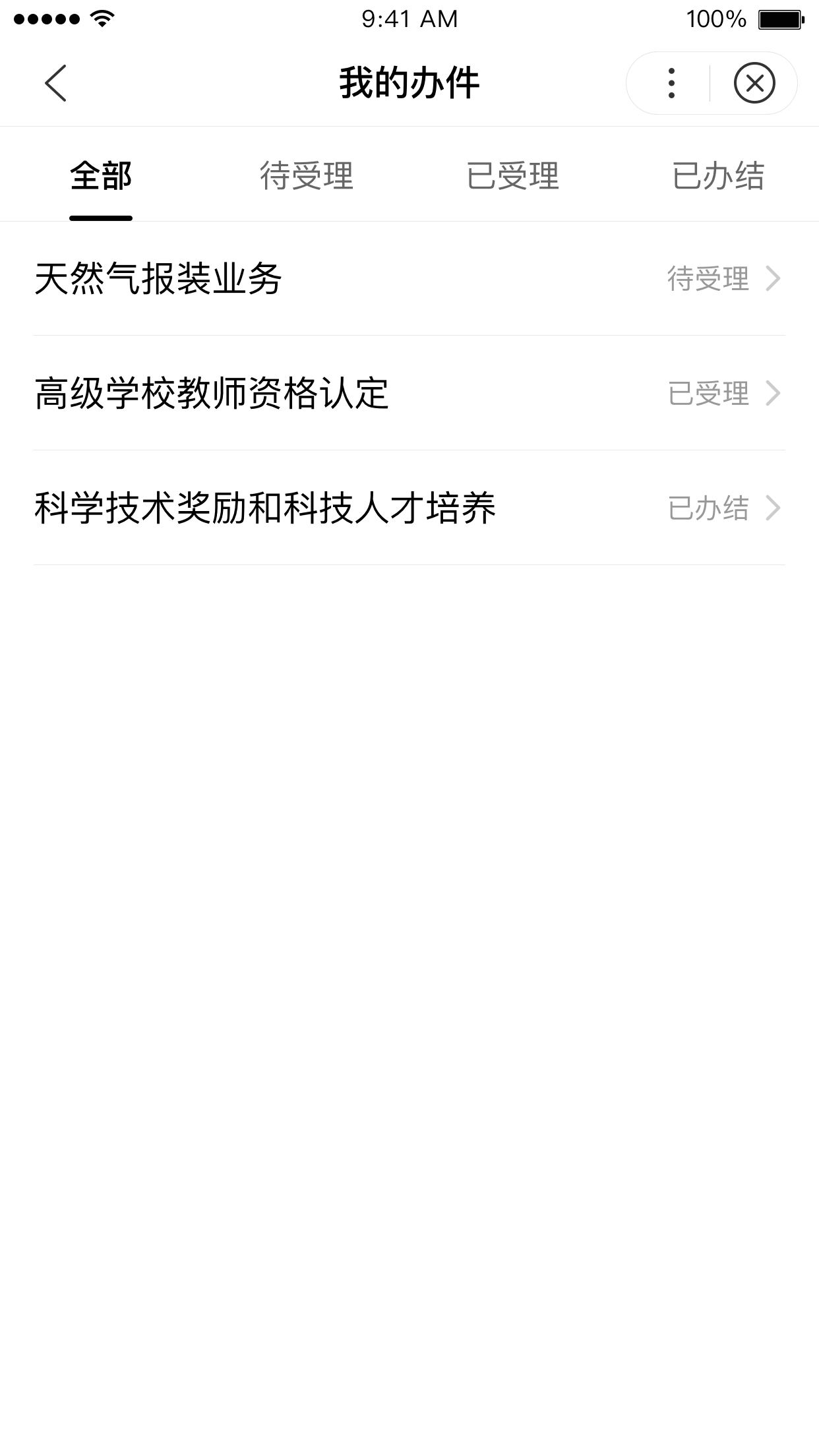 展示用户办理的服务项,包含全部、待受理、已受理、已办结 4 个分类。