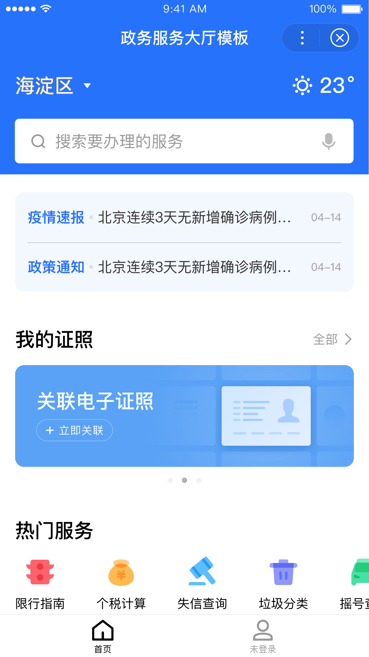 解释: 本模板适用于国家或各省市区政府线上办事大厅的快速搭建工作,模板包含搜索、banner、区域切换、电子证照、热门服务推荐、服务列表、个人中心等功能模块,开发者可根据实际需求对功能模块进行增删改等二次开发。