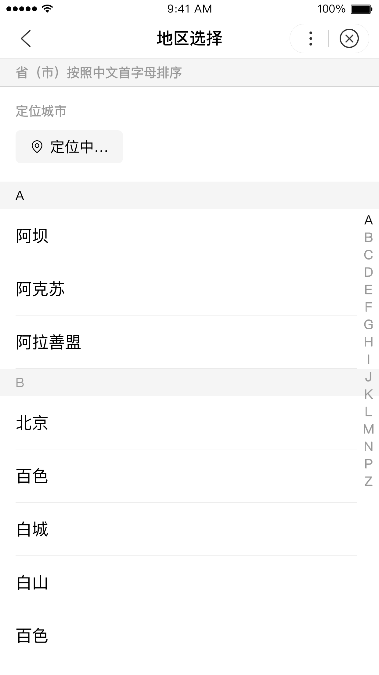 用户可在此页面操作切换地区,支持通过定位选择位置,支持通过历史记录选择位置,支持通过首字母索引查找地区。