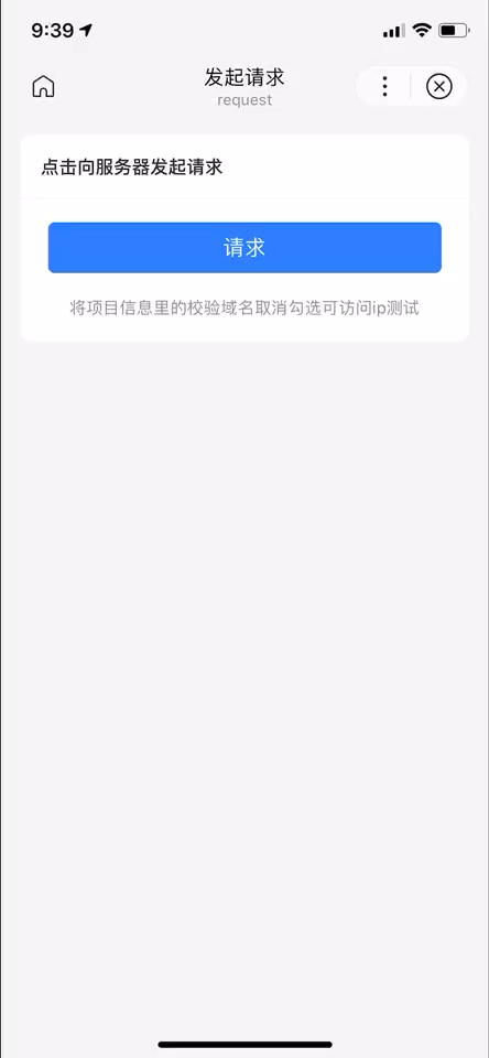 <view class="wrap"><view class="card-area"><view class="top-description border-bottom">点击向服务器发起请求</view><button bind:tap="request" type="primary" loading="{{loading}}" hover-stop-propagation="true">请求</button><view class="tip-week">将项目信息里的校验域名取消勾选可访问 ip 测试</view></view></view>