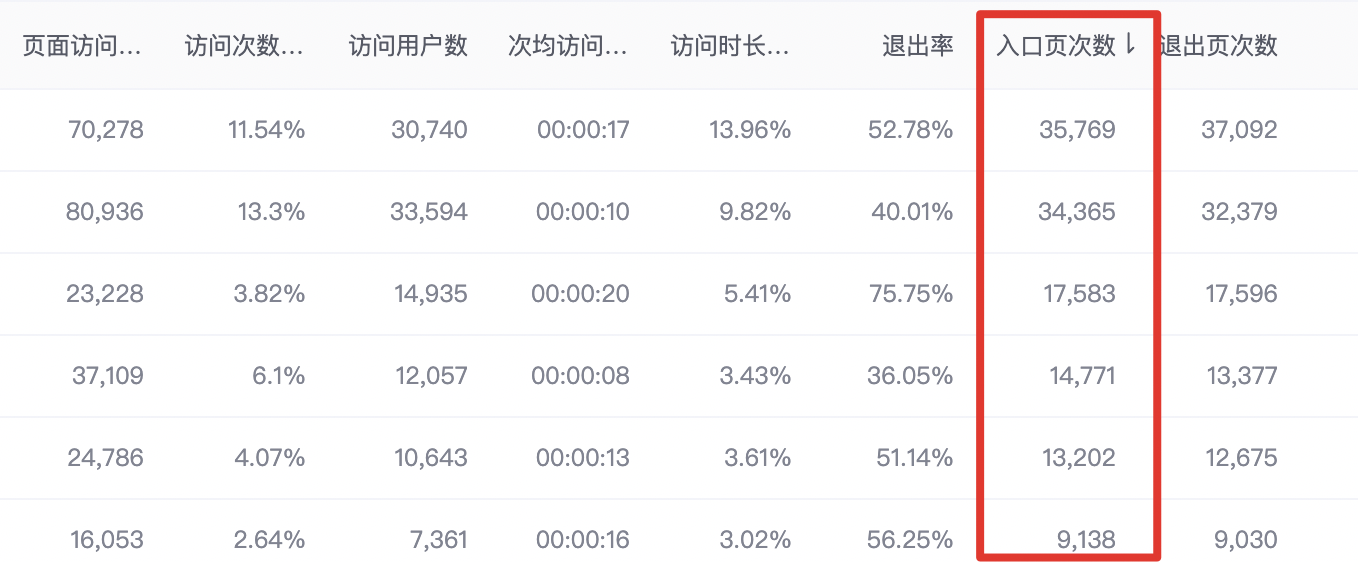 我们需要找到入口访问量大的页面,这些是影响整体 fmp 的重点页面。从开发者平台中找到目标小程序的【数据分析-行为分析】,按入口页次数排序后,我们就可以看到重点页面。