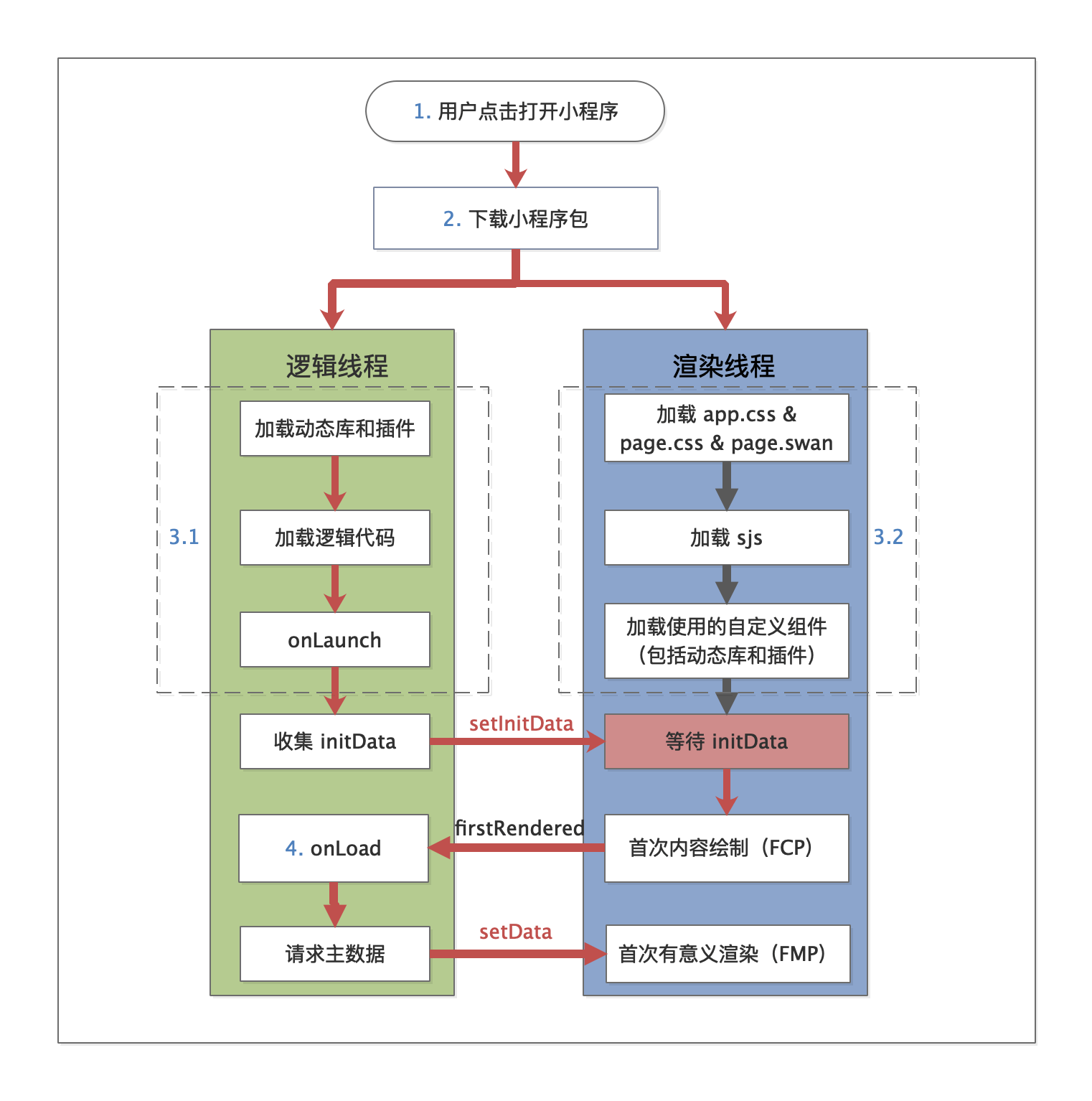 完成模板和样式文件、SJS和当前页面所有使用到的自定义组件加载后,智能小程序框架渲染层初始化完成。如果逻辑层初始化相对渲染层较慢,那么就是渲染层等待initData到达;反之则是initData到达后,等待渲染层初始化完成。