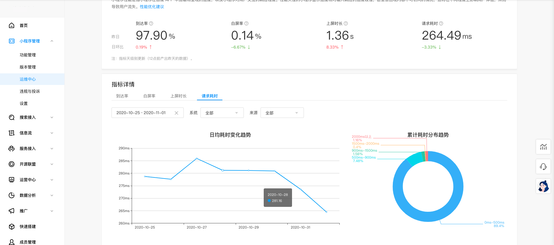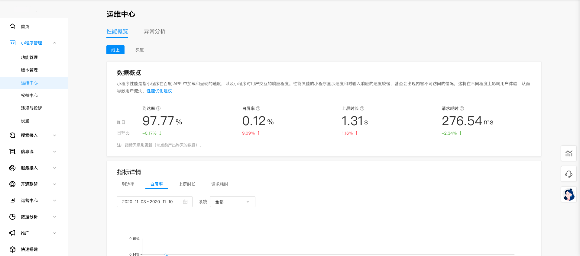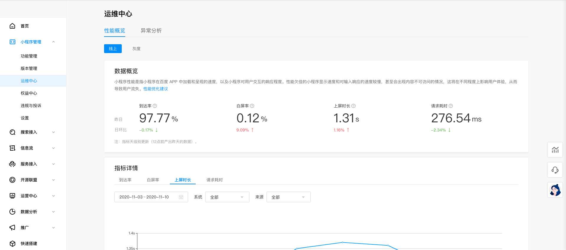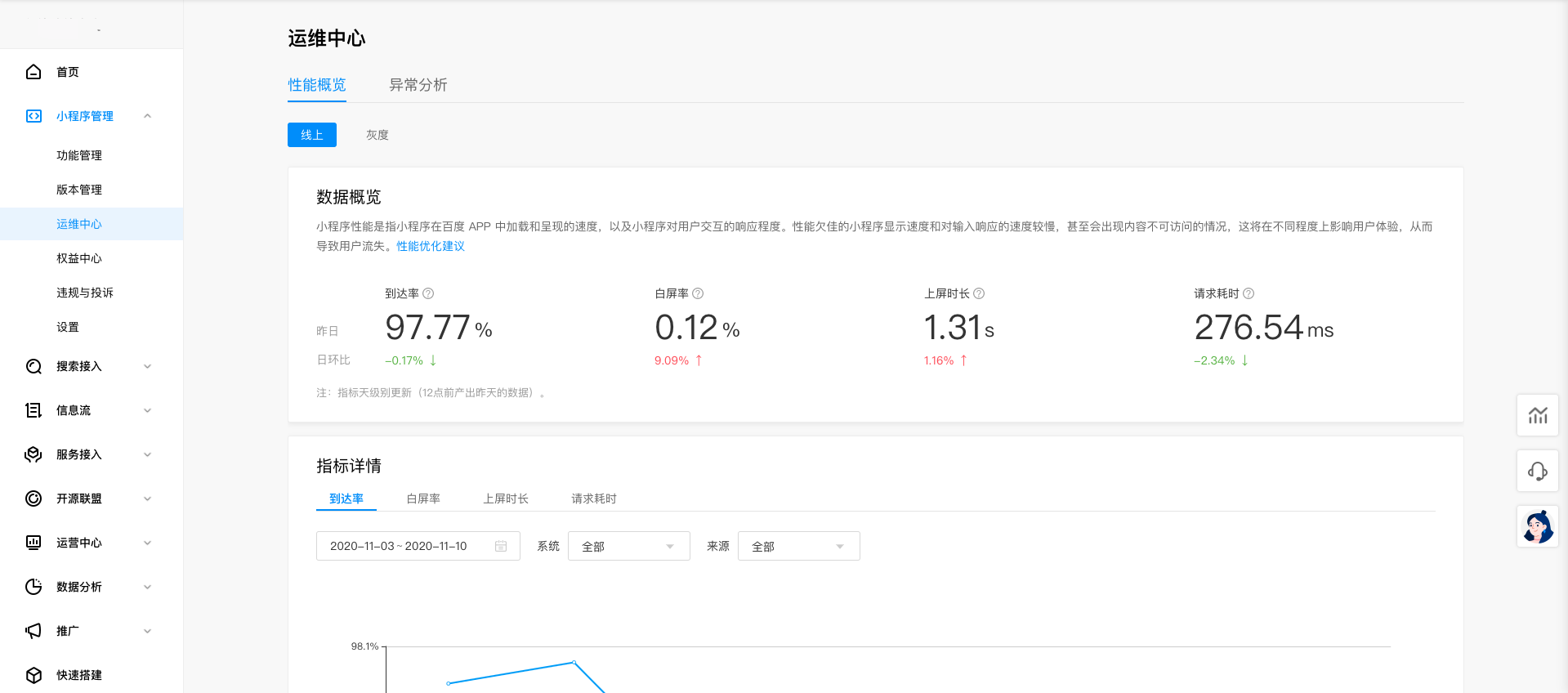 智能小程序为开发者提供了性能监控指标平台,帮助开发者监控小程序的线上加载性能。开发者可以在“开发者平台-开发管理-运维中心”的界面,看到小程序的加载性能监控。