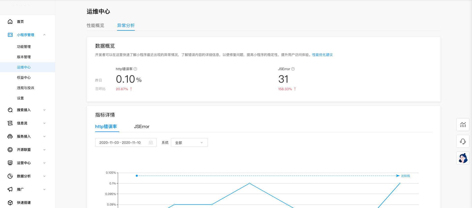 在运维中心中,用户可以监控小程序性能的几项关键指标,分别是到达率、白屏率、上屏时长、请求耗时、HTTP 请求错误率和 JSError 。