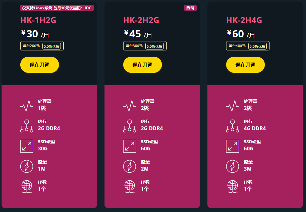 选择香港云服务器的套餐因用户业务而异。 一般来说对于访问量较小的网站例如个人博客,在考虑成本的情况下,选择HK-1H2G套餐就足够了。而HK-2H4G套餐拥有2核4G的配置可以满足大多数的用户需求,比如中小型企业网站、一般性数据处理、跨境电商等。 对于一些对计算性能要求较高的业务,比如中大型运营活动、批量处理、APP应用、游戏服务等,则需要更多的CPU核数和内存。 用户可根据自己的业务量自行调整配置。