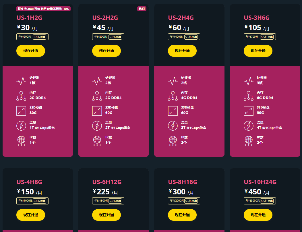 选择要购买的美国云服务器套餐,并点击对应套餐下的【现在开通】,进入配置页面。