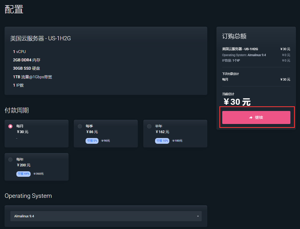 在配置页面,您可以选择付款周期、带宽、IP数量、系统等,并填写主机名,配置完成后,点击【继续】,进入确认信息页面。