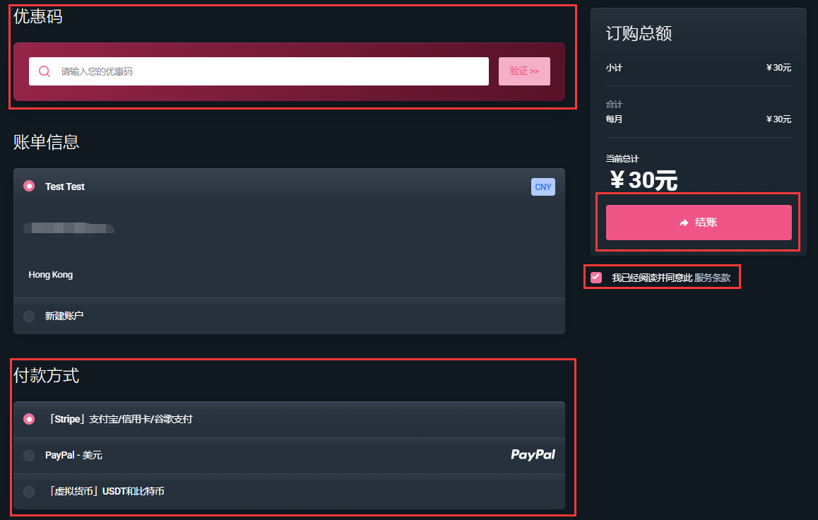 我们需要在确认信息页面选择付款方式,包含:Stripe(支付宝/信用卡)、虚拟货币(USDT和比特币)等,并输入优惠码(如果支持),勾选 我已经阅读并同意此 服务条款 ,并点击【结账】,跳转到选择的对应支付平台。