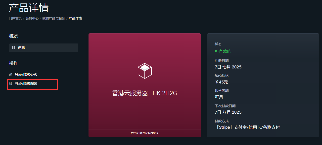 3、在产品详情页面的左侧菜单中,找到并点击【升级/降级配置】,进入升级/降级配置页面。