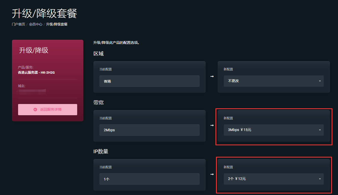 后浪云的香港云服务器支持升级带宽、IP数量等配置,我们可以在订购产品时在配置页选择升级配置: