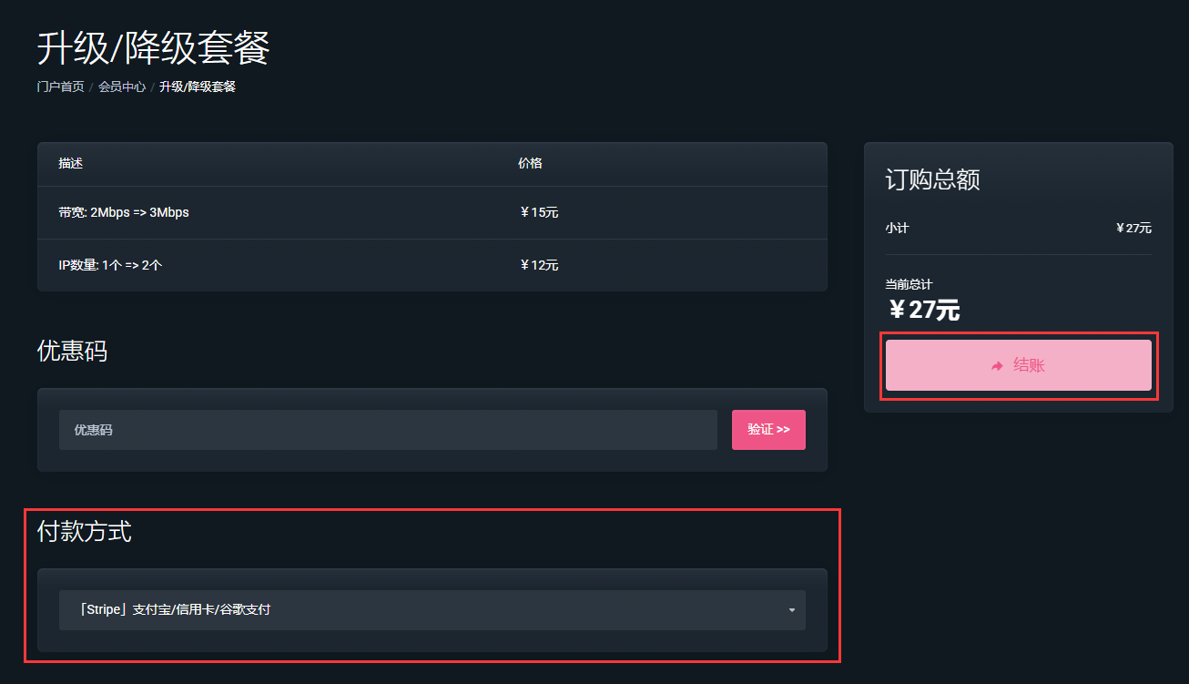 5、在跳转到的页面中选择付款方式并完成结账,即成功升级香港云服务器配置。