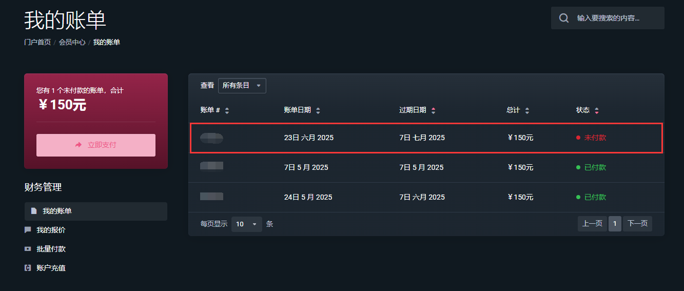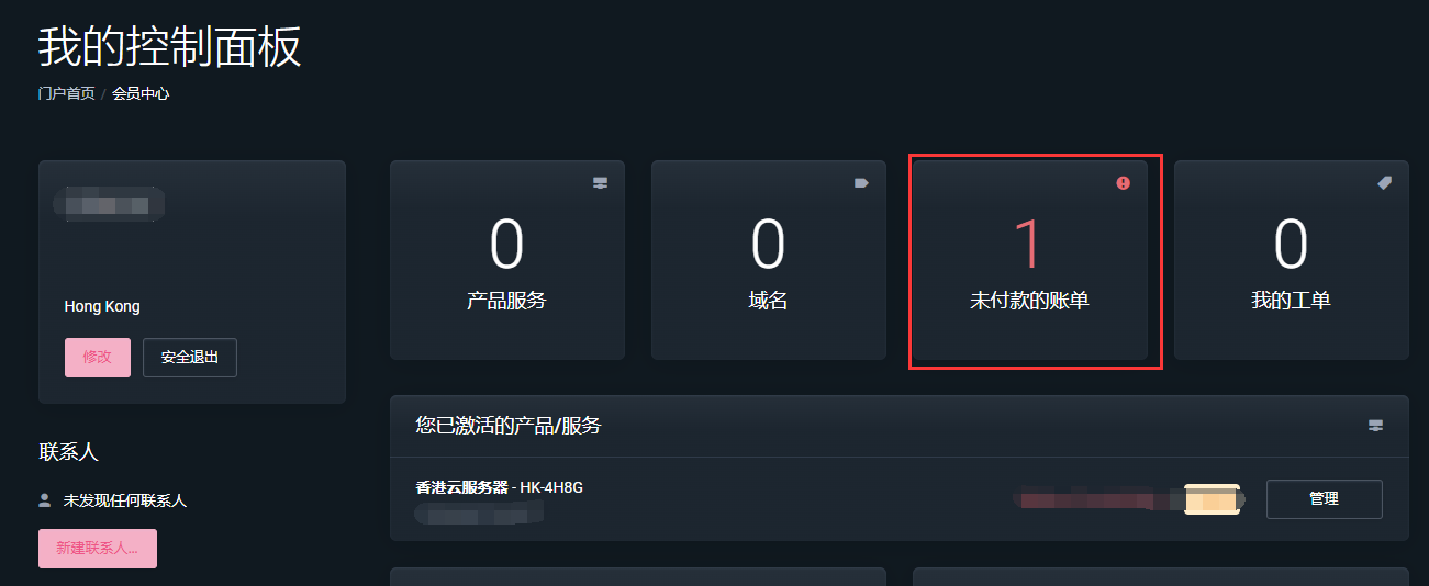 1、登陆会员中心(https://my.idc.net/clientarea.php),点击如图所示的【未付款的账单】,进入账单列表页面。