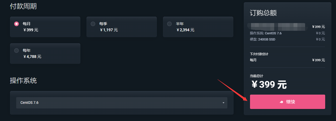 2、在产品配置页选择付款周期、操作系统和其它配置项,点击【继续】,跳转到确认信息页面。