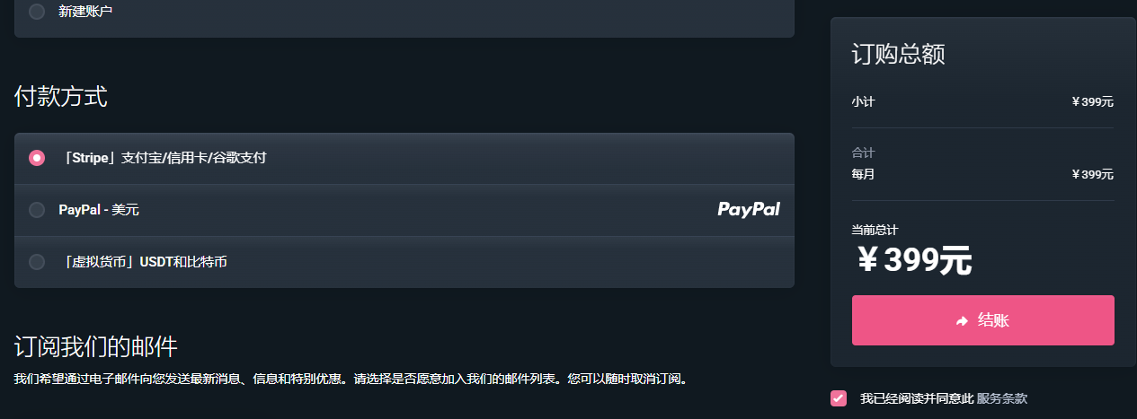 3、我们需要在确认信息页面选择付款方式,包含:Stripe(支付宝/信用卡)、虚拟货币(USDT和比特币)等,勾选 我已经阅读并同意此 服务条款 ,并点击【结账】,跳转到选择的对应支付平台。