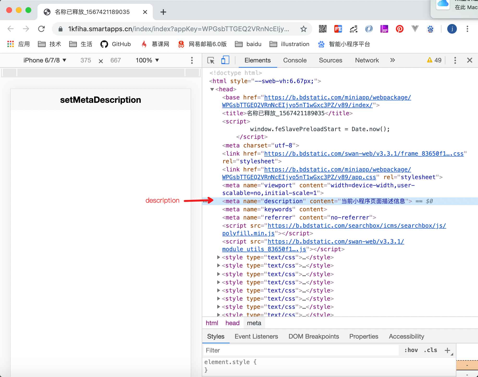 Page({setMetaDescription() {swan.setMetaDescription({content: '小程序 description meta 信息',success: res => {console.log('setMetaDescription success', res);},fail: err => {console.log('setMetaDescription fail', err);}});}});