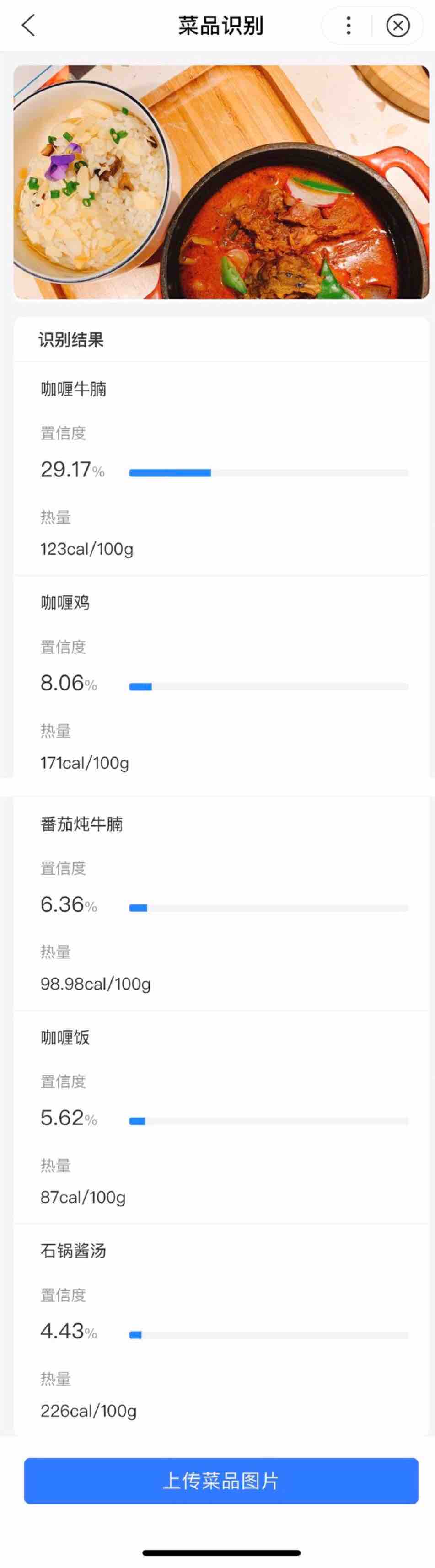 解释:用于菜品识别,即对于输入的一张图片(可正常解码,且长宽比适宜),输出图片的菜品名称、卡路里信息、置信度。